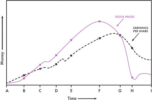The cycle of a typical market boom–bust works like this: In the initial stage (AB), a new positive earning trend is not yet recognized. Then comes a period of acceleration (BC) when the trend is recognized and reinforced by expectations. A period of testing may intervene when either earnings or expectations waiver (CD). If the positive trend and bias survive the testing, both emerge stronger. Conviction develops and is no longer shaken by a setback in earnings (DE). The gap between expectations and reality becomes wider (EF) until the moment of truth arrives when reality can no longer sustain the exaggerated expectations and the bias is recognized as such (F). A twilight period ensues when people continue to play the game although they no longer believe in it (FG). Eventually, a crossover point (G) is reached when the trend turns down and prices lose their last prop. This leads to a catastrophic downward acceleration (GH) commonly known as the crash. The pessimism becomes overdone, earnings stabilize, and prices recover somewhat (HI).